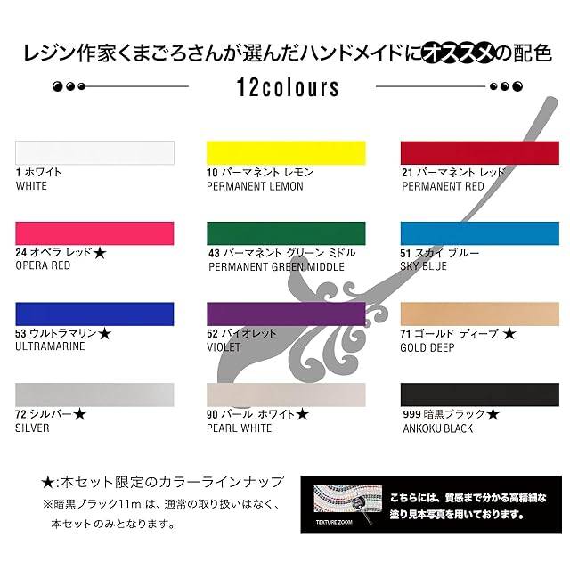 セット内容:ホワイト・パーマネントレモン・パーマネントレッド・オペラレッド・パーマネントグリーンミドル・スカイブルー・ウルトラマリン・バイオレット・ゴールドディープ・シルバー・パールホワイト・暗黒ブラック