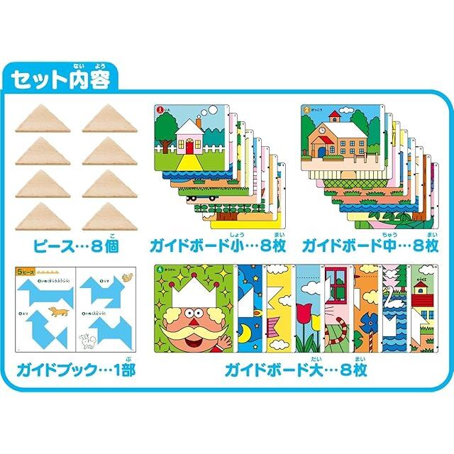 セット内容: 木製ピース8個 ガイドボード24枚(大・中・小各8枚) ガイドブック1部