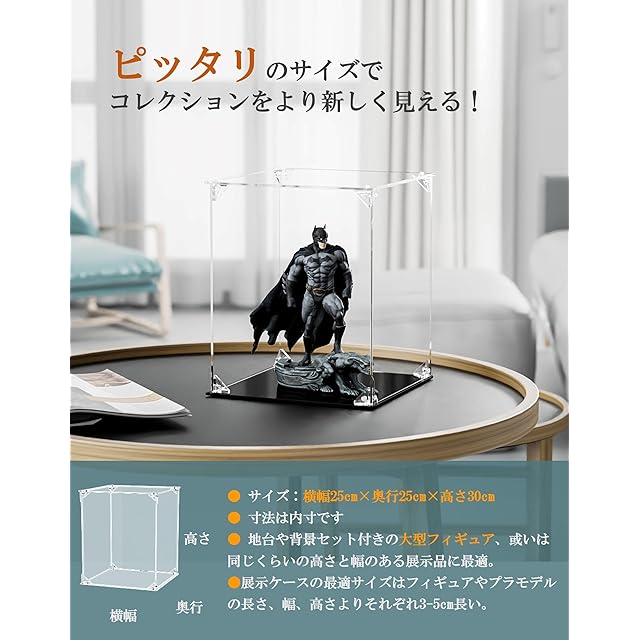 【サイズを決める】● 内寸サイズ:横幅25cm×奥行25cm×高さ30cm ● 外寸サイズ:横幅26.6cm×奥行26.3cm×高さ31cm ● 展示ケースの推奨寸法は飾る物の(幅・奥行×1.1)+5cm、(高さ×1.1)+2cm ● 1/7と1/6スケールのフィギュア、1/100スケールのガンプラ、或いは同じくらいの高さがある大型展示品に適したサイズです。