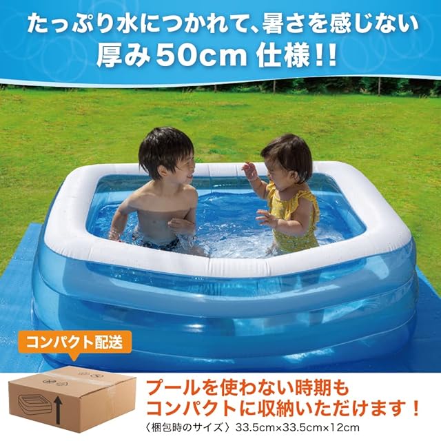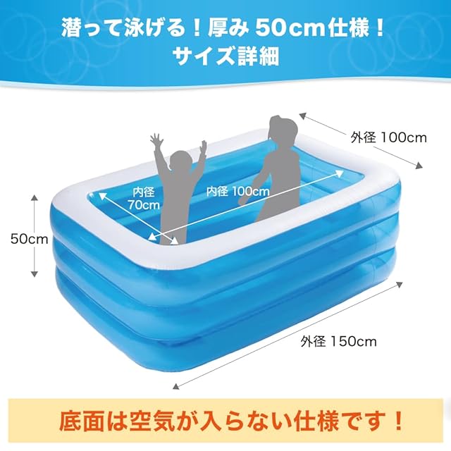 【 ファミリープールとは 】ビニールプールは数多く御座いますが、弊社のビニールプールはここが違います!1.たっぷり水につかれる高さ50㎝ プールの高さが50㎝もあるので、身体全体しっかりと水につかれます。 暑さを感じず、涼しく大型ビニールプールで水遊びすることができます。2.空気入れがラクラク! 空気口は空気漏れを防ぐ3段構造となっています。大人一人でも簡単にビニールプールへ空気を入れることができます。3.プールが透けてるから安心 お子様も、それを見守るご家族も安心して遊べるようにビニールプールの側面が透けている仕様となっています。しっかりとプールの中まで見えるので、安心して楽しく遊ぶことができます。