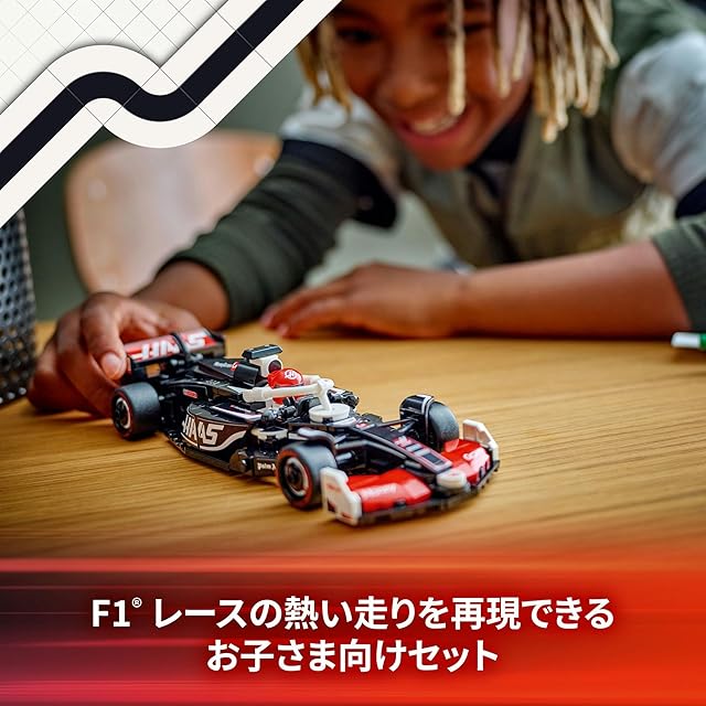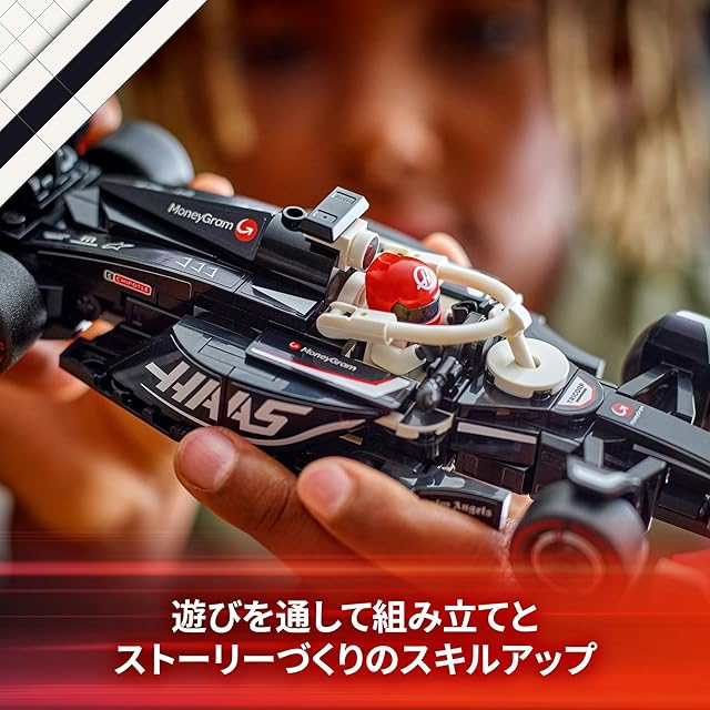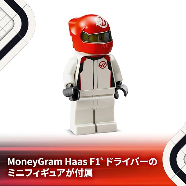 ミニフィギュア1体付属 – MoneyGram Haas F1チームのレーシングスーツとヘルメットをかぶったドライバーのミニフィギュアがレースごっこで大活躍