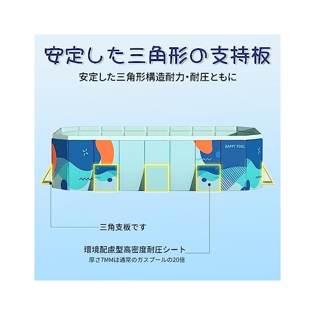 【水漏れ防止・安定した三角構造】厚さ7mmの高強度4層コンポジットでを使用し、底面には3mmの高品質PVC素材を使用しているので、耐摩耗性と耐パンク性、水漏れを防ぎ、従来のインフレータブルプールに比べて3倍以上長持ちします。側面には安定した三角形の支持板を使用し、プールの圧力や変形に強くなっているので、夏の水遊びも楽しくできます!