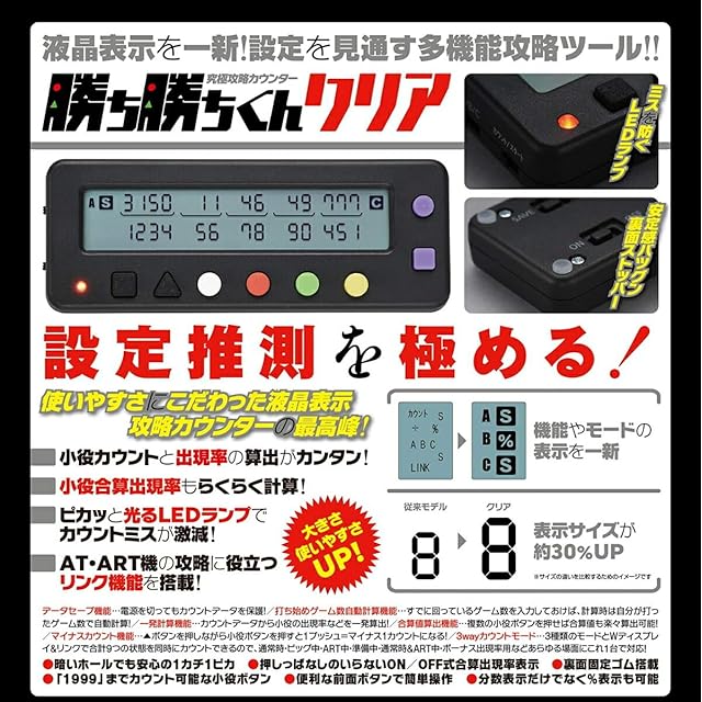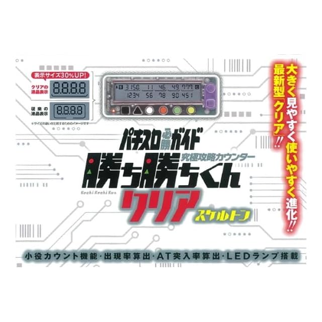 勝ち勝ちくん、6年半ぶりにリニューアルしたスケルトンVer.が登場!!(2019年6月28日発売)<br> <br> <br> 便利機能満載のパチスロ攻略カウンター『勝ち勝ちくん』がさらに使いやすく、さらに便利になって新登場!!<br> <br> …といっても元々スロッターがスロッターに向けて考案した商品ゆえ、基本的な仕様としてはこれ以上のものがありません。<br> 今回改良した唯一にして最大のポイントは、ズバリ『見やすさ』!!!!<br> ★★★カウント部分は今までの表示から30%アップ!★★★<br> ★★★モード等を示す各種文字類もアイコン化して大きく表示!★★★<br> <br> そして従来通りカウントミスを防ぐLEDランプは、ボタンを連打したって安定の1カチ1ピカ。ガッチリ固定の裏面ストッパーに、前面ボタンでのラクラク操作などなど、多くのスロッターから支持を受けたパチスロカウンターとしての機能は全てそのまま、『表示を大きく』『見やすく』に徹底的にこだわった新型勝ち勝ちくん。<br> <br> 「でも本体も大きくなったんじゃ、せっかくの置きやすさと持ち運びやすさが…」<br> ご安心ください。本体サイズはそのまま、同じです!<br> <br> 「余計なことして、せっかくの使いやすさがダメになるパターンじゃ…」<br> 大丈夫です。操作性に関わる部分は完全にそのまま継承しています!<br> <br> 表示が大きく、見やすくなった新型『究極攻略カウンター勝ち勝ちくんクリア』<br> カチカチ数えて設定をハッキリと見極めろ!!<br> <br> <br> ★Wディスプレイ★<br> 上段・下段に分かれた2段ディスプレイを採用。通常時&ボーナス中など、別場面の小役カウントが一画面で行えます。しかも、上下の切り替えは本体表面にあるボタンを押すだけ…と超簡単! ! <br> 3つのモードとWディスプレイ&リンクの組み合わせで、最大9場面にまで対応できます。<br> <br> ★リンク機能★<br> 「リンクモード」にすると、上下段が文字通りリンクします。これにより各役の重複率、各役からのART突入率なども一画面でパパッと算出可能! ! 分数表示も%表示もできるのが嬉しい! ! <br> <br> ★LED機能★<br> 暗い場所では押したかどうか不安になります。本商品ではボタンを押せばLEDが光ってお知らせしてくれるので、ミスカウントが激減。より正確な設定推測が可能です。<br> <br> ★そのほか使い勝手が良い★<br> ●押しっぱなしのいらないON/OFF式合算出現率表示 ●簡単ゲーム数カウントボタン ●裏面固定ゴム搭載 ●「1999」までカウント可能な小役ボタン ●便利な前面ボタンで簡単操作 …などなど、「使いやすさ」を徹底的に追求! ! <br><br> Copyright (C) Pエンタメストア<br>