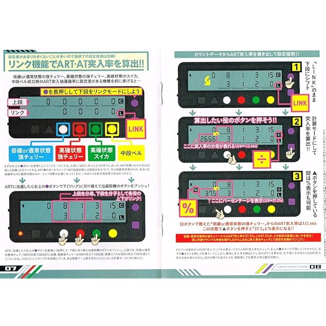 ●大きくて見やすい液晶表示。●Wディスプレイ。●リンク機能。●LED機能。●押しっぱなしのいらないON/OFF式合算出現率表示。