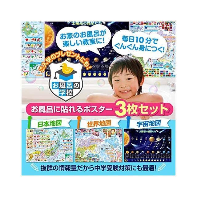 商品名:お風呂の学校 日本地図&世界地図&宇宙地図(太陽系)お風呂ポスター 3枚セット 日本製 B3サイズ 地理 社会 知育 学習 防水