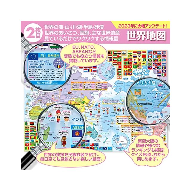 世界地図:各国の国旗と主要都市、ランドマークが地図に表示され、国際的な理解を深めます。旅行計画や国際関係の学習に役立ちます。世界各地の自然環境や動植物、国際機関や組織の情報も詳述。地理と生物学、国際関係を統合的に学べる豊富な情報量です。