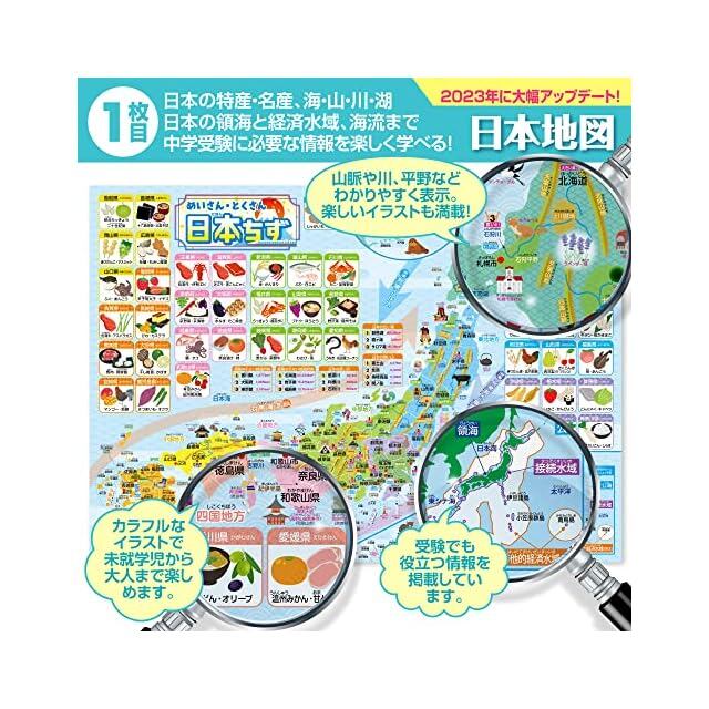 日本地図:各地域の特産品や名所がイラストで表示され、一目で理解できる構成。食べ物や名所を学びながら日本各地の文化と地理を楽しく学べます。山脈、川、湖などの地理的特徴が明確に描かれ、各県の面積や人口情報も掲載。視覚的に地理データを学びやすい設計で、学習に最適です。