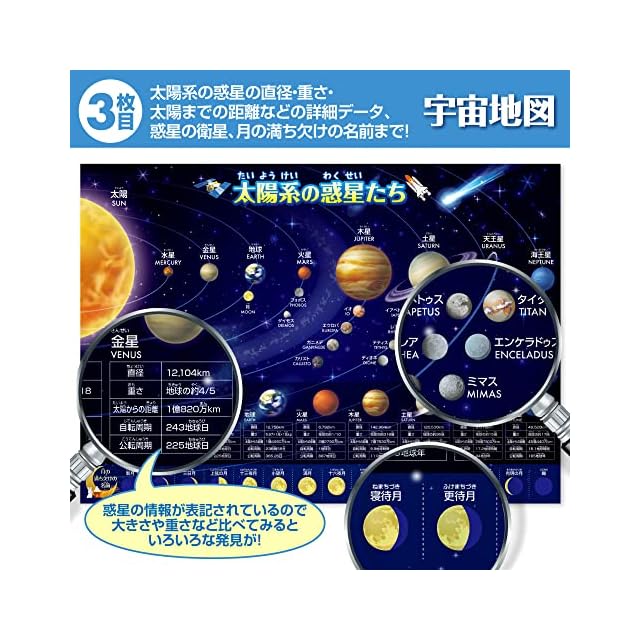 太陽系惑星地図:太陽系全体の構造が視覚的に理解でき、各惑星の詳細なデータが満載。月の満ち欠けや探査機の情報もあり、天文学の基礎から応用まで網羅しています。