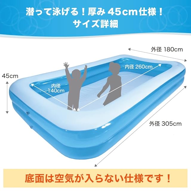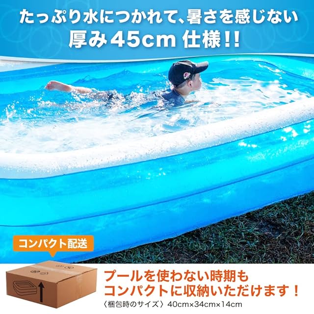 【 ファミリープールとは 】ビニールプールは数多く御座いますが、弊社のビニールプールはここが違います!1.たっぷり水につかれる高さ45㎝ プールの高さが45㎝もあるので、身体全体しっかりと水につかれます。 暑さを感じず、涼しく大型ビニールプールで水遊びすることができます。2.空気入れがラクラク! 空気口は空気漏れを防ぐ2段構造となっています。空気入れをつかえば、大人一人でも簡単にビニールプールへ空気を入れることができます。3.プールが透けてるから安心 お子様も、それを見守るご家族も安心して遊べるようにビニールプールの側面が透けている仕様となっています。しっかりとプールの中まで見えるので、安心して楽しく遊ぶことができます。