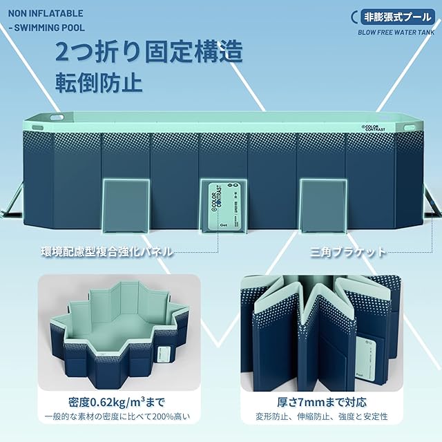 新改良 非膨張式プール 大型 空気入れ不要 屋内/屋外兼用 折りたたみ式 耐荷重強化デザイン 子供用ビニールプール 新開発の非膨張式設計 空気入れ不要で30秒即設置!面倒なポンプ作業から解放され、お子様とすぐに水遊びが楽しめます。 超耐久3層構造 厚み0.6mmの高密度PVC+耐摩擦メッシュ層で、石や砂利にも強い。鋭利な物が当たっても破れにくい設計です。