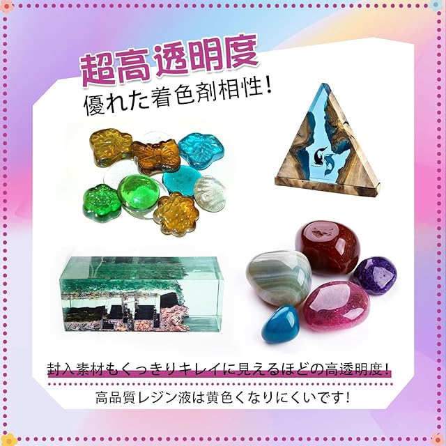 レジン液の高透明感:ガラスのような透明感が、固まったら長い時間でも黄変しない。着色剤との相性も良く、発色はとっても鮮やか! 硬化後、透明度も高く、綺麗に仕上がる。そして時間が経つにつれて簡単に黄色くなることはありません。