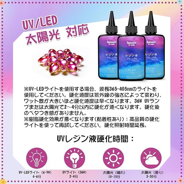 UV-LED対応と急速硬化:最新樹脂仕様、硬化時間が短い。UVレジン液は紫外線ランプやLEDランプと組み合わせて使用できます。太陽光でも簡単に液体を硬化させることができます。経験者も初心者も使いやすいです。