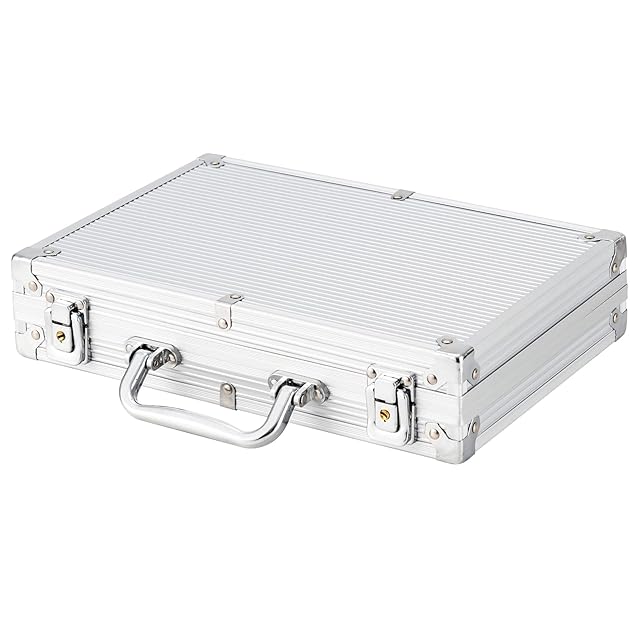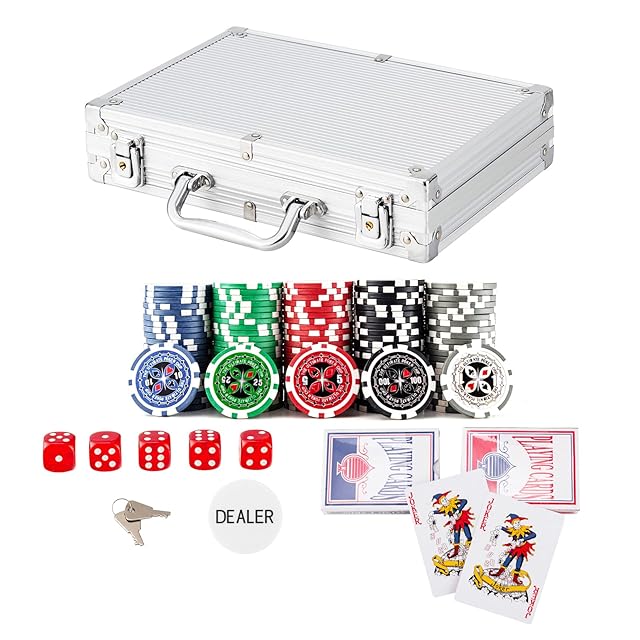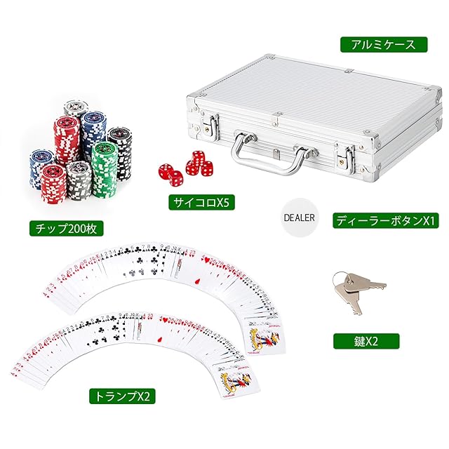 *セット内容:チップx200枚;ケース/シルバーx1個;サイコロx5個;トランプx2組;ディーラーボタンx1個;鍵x2本