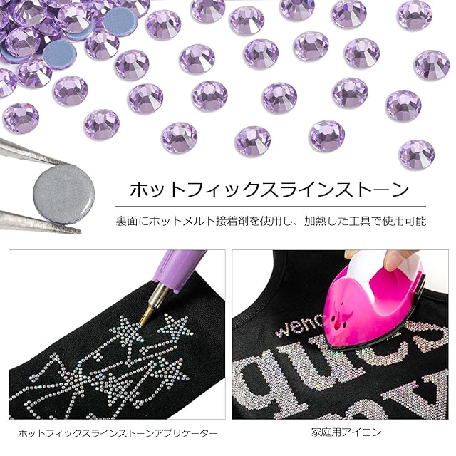 使用は簡単:ガラスラインストーンの裏面にホットメルト接着剤があらかじめ付けられています。フラットバックラインストーンを固定するには、家庭用アイロンまたはホットフィックスラインストーンアプリケーターをご使用ください。熱を加えずに接着剤を付けての使用も可能です。