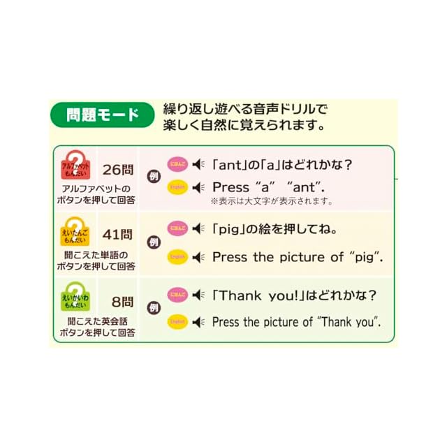 【収録内容】アルファベット:英単語、英単語のフォニックス、英会話、ABCの歌、問題モード全75問
