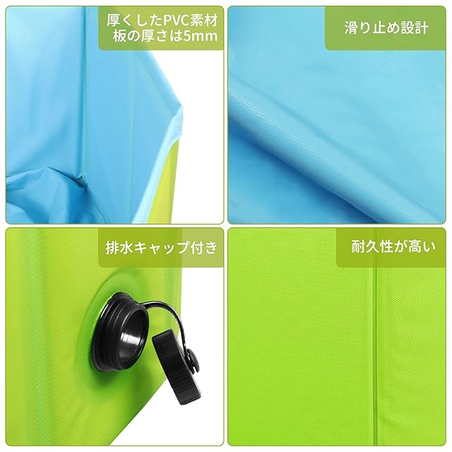 【水漏れ防止】高品質なPVCの素材で、内蔵は高強度のポリプロピレン板(PPボード)で作れます。仕立てがよく、縫製も丁寧のプールです。ボードの厚さは5mmで、厚くした板でしっかり支えてくれます。側面や底部に滑り止め模様を採用し、滑りにくくしています。高さは30cmなので、溺れる心配はありません。子どもやペットも安全に水遊びができます