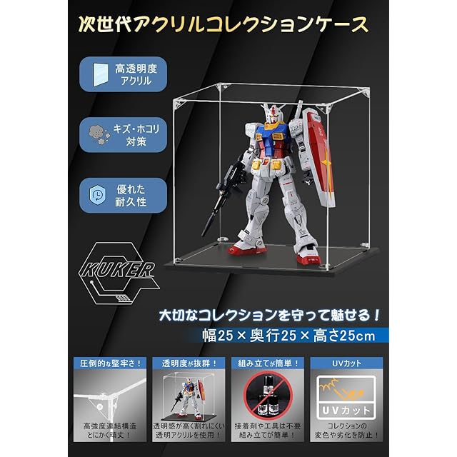 KUKERフィギュアケース アクリルケース UVカット コレクションケース ディスプレイケース 組み立て簡単 頑丈 汚れ防止 手袋 クリーニングクロス付き(25×25×25cm)