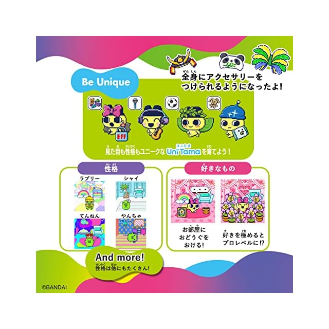 見た目も性格も個性的な、あなただけのたまごっち“Uni Tama”を 友達と”ツーしん”することでどんどんユニークに育てることができます。
