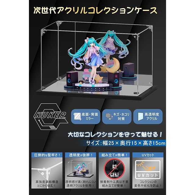KUKERフィギュアケース 横長タイプ アクリルケース コレクションケース ディスプレイケース 背面・底面ミラー付 組み立て簡単 頑丈 汚れ防止 手袋 クリーニングクロス付き(25×15×15cm底面・背面ミラー)