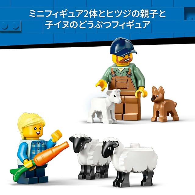 セットの内容 – トラクターとトレーラーの組み立てに必要なパーツ、ミニフィギュア2体、どうぶつフィギュア(ヒツジ2体、子ヒツジ1体、子犬1体)