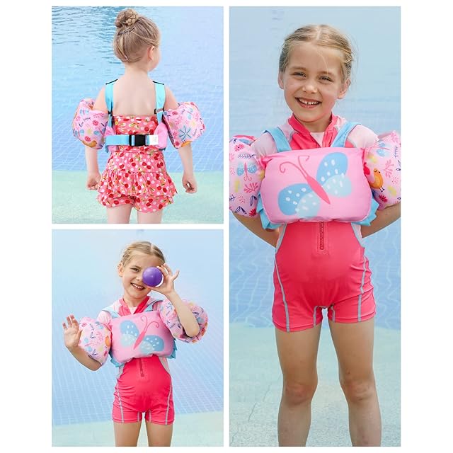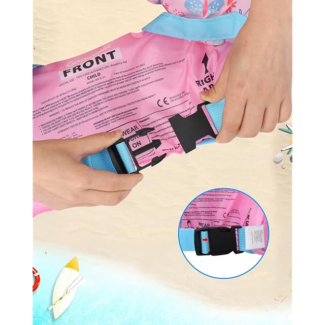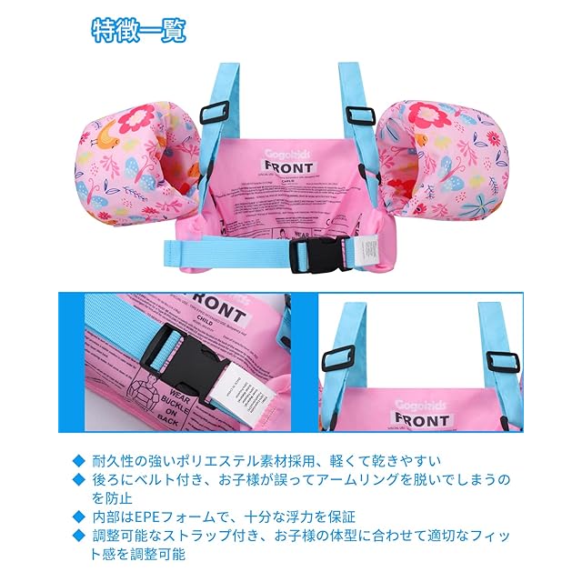 【使いやすさ】腕を通して、バックルで簡単に装着するだけです。お子様も嫌がらずにつけてもらえます。調節可能なストラップは、9〜22㎏のお子様に適切な浮力サポートを提供します。