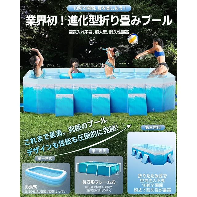 【一歩先行く!6つの大きな排水口、排水が迅速、収納便利】Alwgreenは、常により良い製品を提供することを使命とし、絶え間ない改善を続けています。Alwgreenの超大型家庭用プールは、耐久性のある設計だけでなく、利便性も考慮されています。側面と底部に合計6つの大きな排水口を設置し、排水速度が速く、排水が簡単で徹底的です。従来品は排水に3時間かかりますが、Alwgreenは1時間で完全に排水できます。さらに、従来品の排水不完全や清掃などの問題も完璧に解決しました。空気入れ不要プールは簡単に折りたたむことができ、コンパクトに収納・キャンプや旅行に適しているほか、自宅での収納スペースを確保することができます。