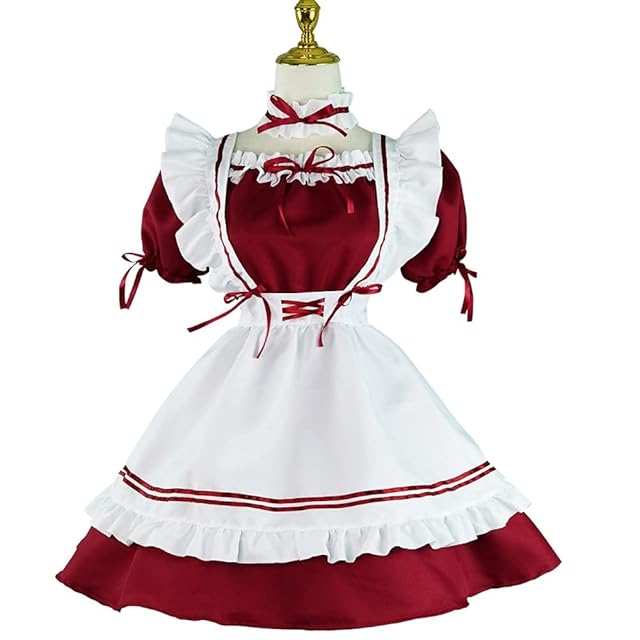 [ANONIE] メイド服 コスプレ仮装 初心者 セット かわいい コスチューム ホワイト+ブラック 豪華セット (red, S)