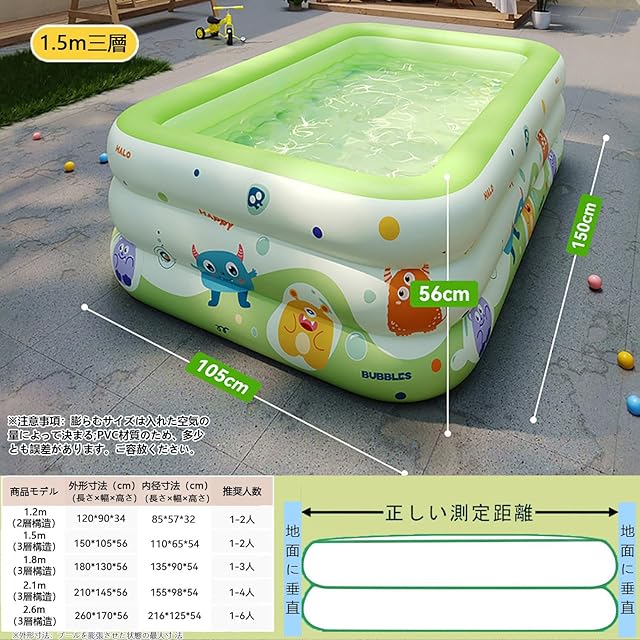 【家族で楽しめるビニールプール】複数サイズで選べる家庭用プール。1.2m(幼児用)~2.6m(大人5-6人対応)まで複数サイズ展開!お庭やベランダの水遊びに最適なキッズプール。夏の暑さ対策に、子供と一緒に楽しめるファミリープールです。✨外径150×105×56cm/内径110×65×54cm/3層構造。中型設計で、2~3歳児2人または大人1人+子ども1人がゆったり入浴可能。56cmの水深で水鉄砲遊びも存分に楽しめます。※材質の特性上、商品サイズは温度や空気量で多少変化します。