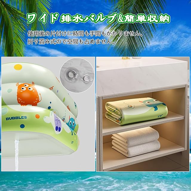 【3層強化PVC】40ミクロンの厚みで耐久性抜群!業界標準より厚い3層PVC採用。破れにくく、長く使える高品質素材。BPAフリーで赤ちゃんも安心。独立気室設計で安全性も向上。空気の偏りが起きにくく、水を溜めても安定した設計となっています。