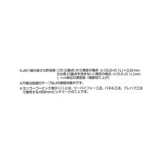 便利なロック機能付き ・テープを固定できる、ロックタイプ ・0点補正移動爪 ・ショックアブソーバー付 仕様 ・目盛仕様:メートル目盛、JIS1級 ・テープ幅:22mm ・テープ長さ:10m ・ヨンゴーゴーピッチ表示付 ・ストラップ付 ・大型ベルトクリップ付 ・爪飛び防止用プロテクター付 ・ステンレスバネ 材質 ・テープ:SK85(旧SK5) ・バネ:SUS301 ・ケース:ABS樹脂