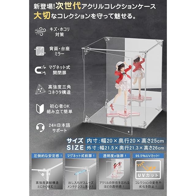 商品名:KUKER フィギュアケース アクリルケース UVカット 台座ミラー 背面ミラー マグネット付き 前扉 コレクションケース ディスプレイケース ショーケース 組み立て式 汚れ防止 手袋 クリーニングクロス付き (幅20×奥行20×高さ25cm,台座ミラー+背面ミラー)