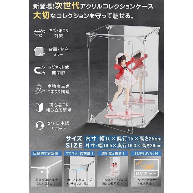 KUKER フィギュアケース アクリル 台座ミラー 背面ミラー マグネット式 磁石付き 前扉 コレクションケース より堅固 組み立て式 アクリルケース ディスプレイケース 防汚れ 手袋 クリーニング クロス付き