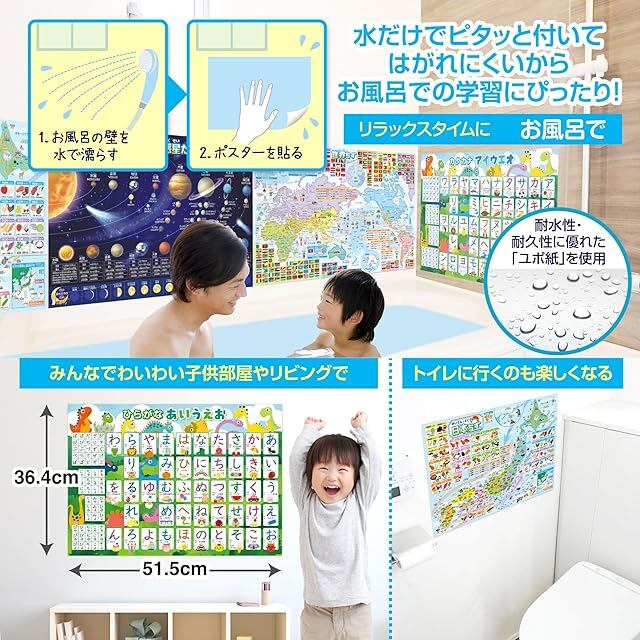 商品名:お風呂の学校 セット価格 地図/ひらがなとカタカナ(恐竜)お風呂ポスター2種類セット 日本製 地理 学習 知育 社会 お受験 B3サイズ 防水