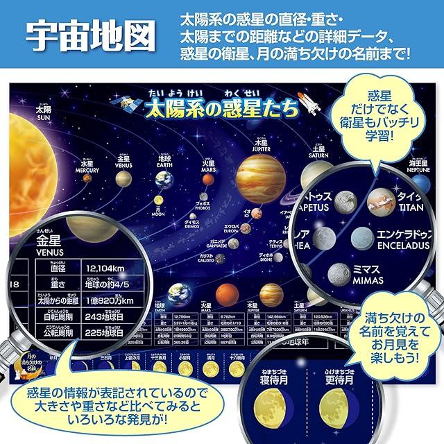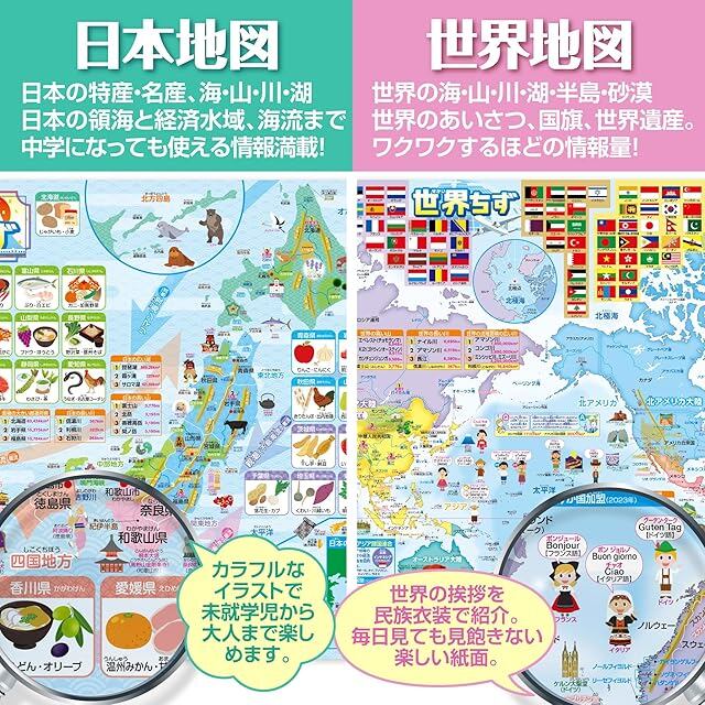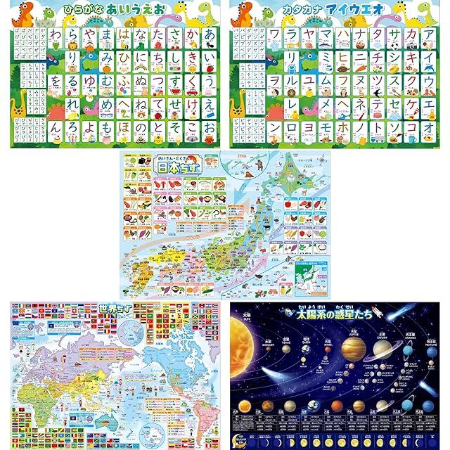 『ひらがな』と『カタカナ』を一目で覚えられる、知育ポスター。初めての文字学習をサポートし、日常の学びに最適です。日本地図は各都道府県の名産・特産物、県庁所在地、山、川、山地、海流など情報量満載、世界地図には地域ごとにまとめられたわかりやすい国旗、首都、主要都市、山、川、山地、砂漠、世界遺産、世界の挨拶、ランキングなど業界随一の情報量、宇宙地図には太陽系の惑星の情報や月の満ち欠けの名称を記載しています。