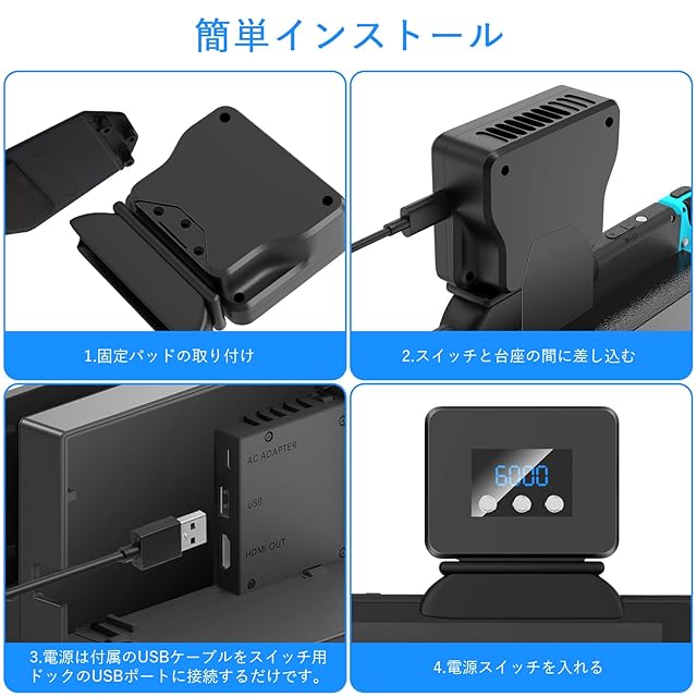 【簡単設置】Switch本体とドックの間にファンを差し込み電源は付属USBケーブルをSwitchドックのUSBポートに接続します。スイッチONで冷却をスタートします。