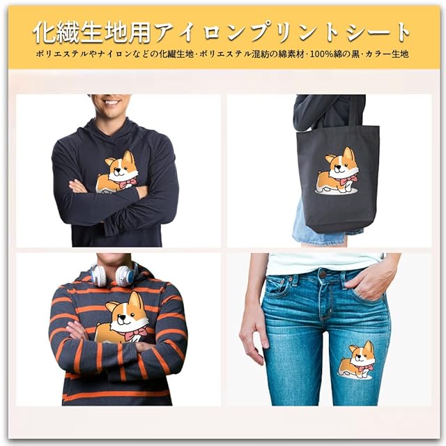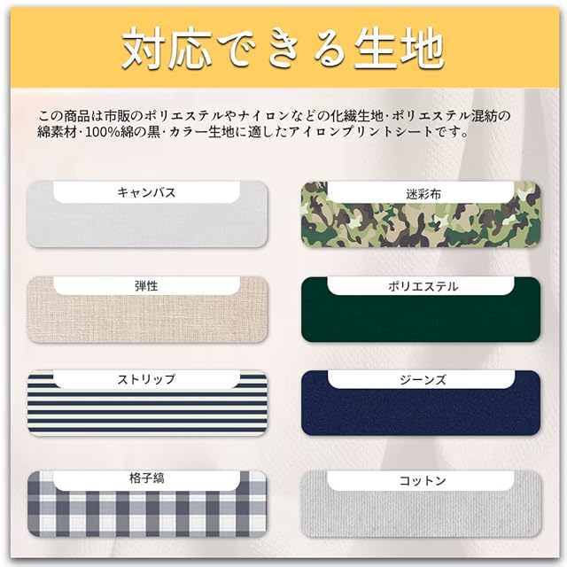 転写できる生地:純綿生地,化繊生地、ポリエステル混紡の綿素材に適用します。*『アイロン低』の表示マークがある生地には使用できません。*