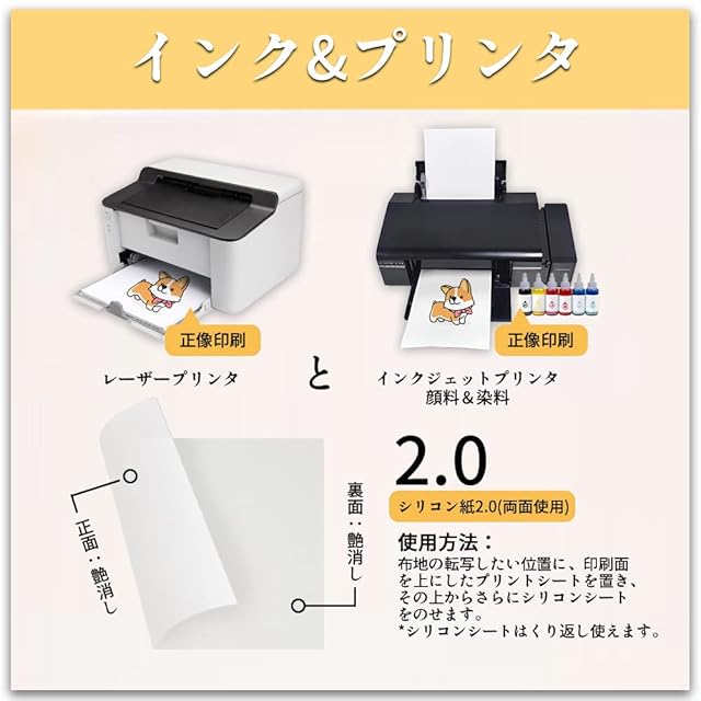 対応できる家庭用プリンター:インクジェットプリンター(染料・顔料インクに対応)、レーザープリンター