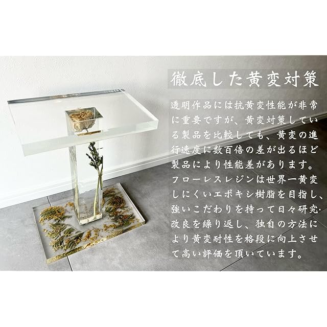 特徴2、徹底的に黄変対策にこだわっているフローレスレジンの中でも最も黄変しにくいモデル。黄変させたくない無色透明作品には最良の選択肢です。 フローレスレジンは黄変対策に注力しており、第三者機関が多数の国内販売エポキシ樹脂を集めて行った紫外線テストでは、注型用フローレスレジンが最高水準の難黄変樹脂であったとの評価証明を頂きました。この評価を頂いた後も自社で研究を続けて、黄変耐性を更に向上させるためフローレスレジン独自の最新の知見を盛り込んだ改良を繰り返し進化を続けています。各モデルのフローレスレジンにも同様の優れた黄変対策を採用しています。