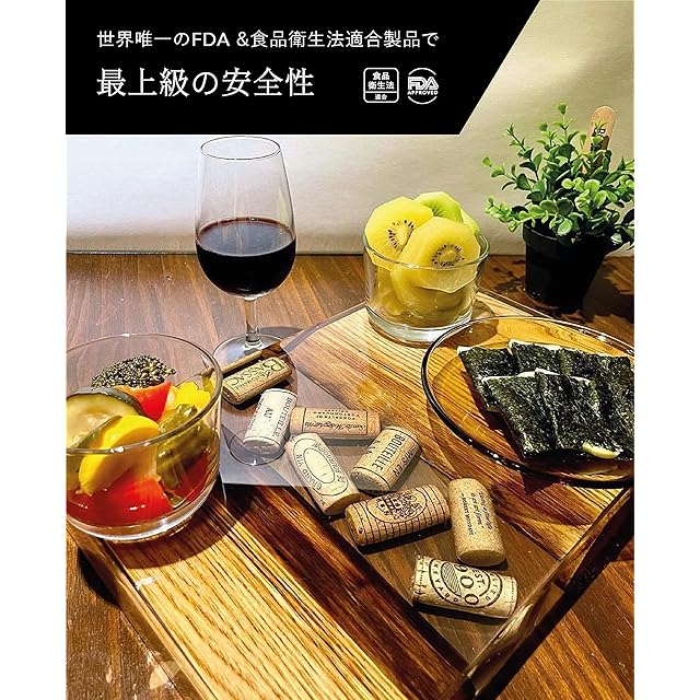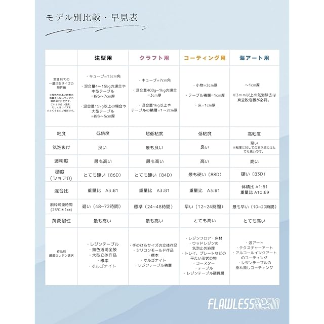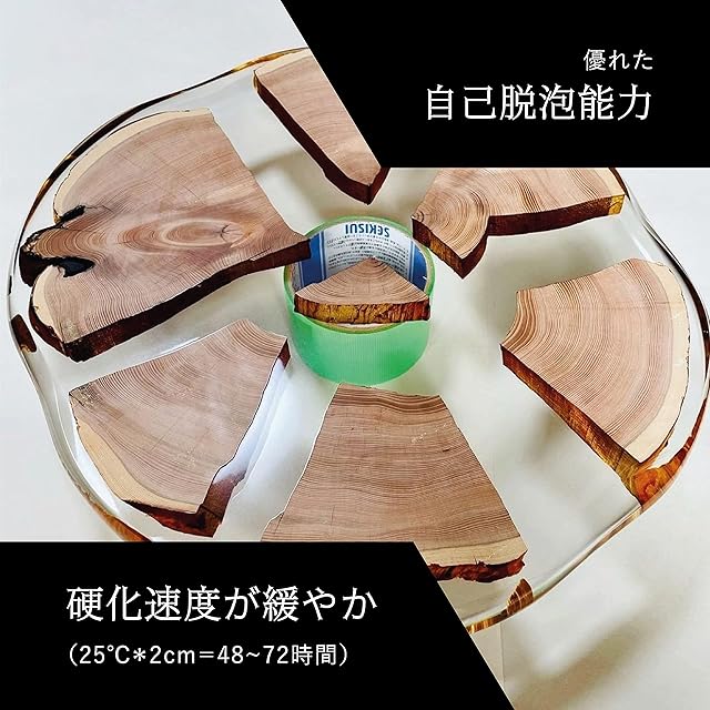 最適な用途 :レジンテーブル、オブジェなどの大きな作品。 標本などの黄変させたくない無色透明の作品など。 ※エポキシ樹脂は硬化時間が長いと表面にシワ模様が発生しやすくなります。更に厚みが薄い、室温が低い、シリコンモールドが柔らかい事なども要因となります。研磨仕上げしない作品の場合は、硬化後・脱枠前に硬化の速いエポキシ樹脂で天面をコーティングするとシワ模様を消すことが出来ます。