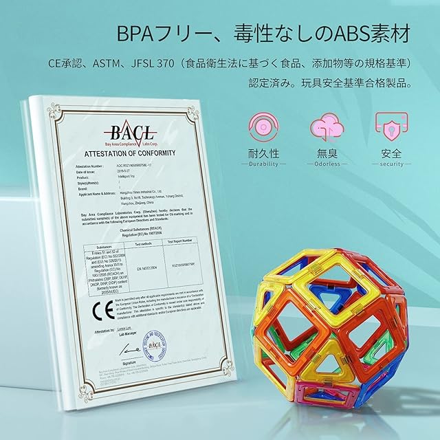 【安全・安心】MAGBLOCKマグネットブロックは、安全で信頼性の高い知育玩具であるABS樹脂で作られています。CE承認、CPC(Children's Product Certificate)EN-71、ASTM(アメリカの基準)、JFSL 370(食品衛生法に基づく食品、添加物等の規格基準)認定済み。
