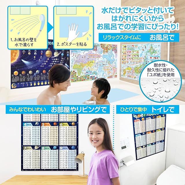 商品名:お風呂の学校 セット価格 地図/インド式かけ算(1-9の段)宇宙 お風呂ポスター2種類セット 日本製 地理 学習 知育 社会 算数 九九 B3サイズ 防水