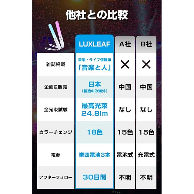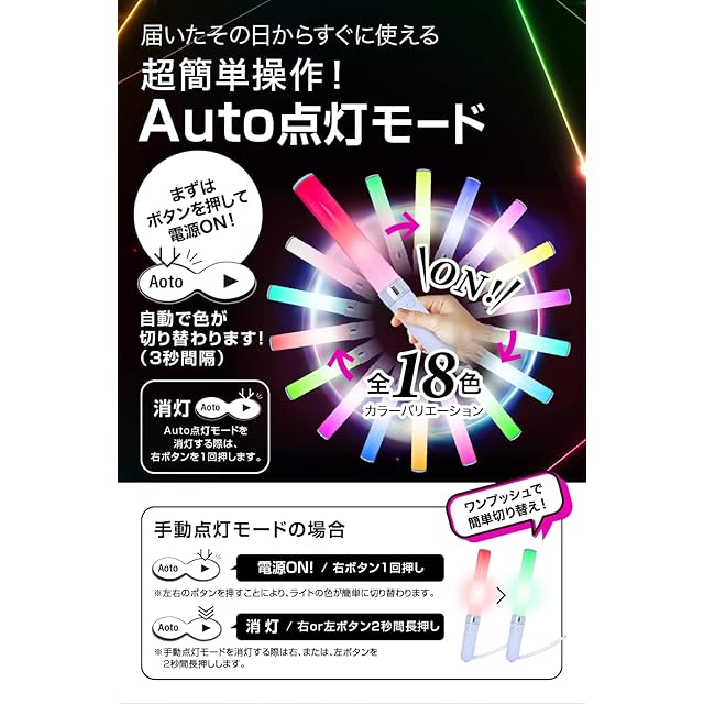 音楽・ライブ情報専門誌「音楽と人」掲載モデルのペンライトです。 大阪産業技術研究所にて全光束試験を実施し、最高光束24.8lmを記録した圧倒的に明るい輝きを放つペンライトです。 操作ボタンは2つのみのため、auto点灯モードも手動点灯モードもらくらく切替可能で、届いたその日からすぐにお使いいただけます。 また、単四電池3本で使用できるため、いつでも電池交換いただくことにより、すぐにご使用できます。
