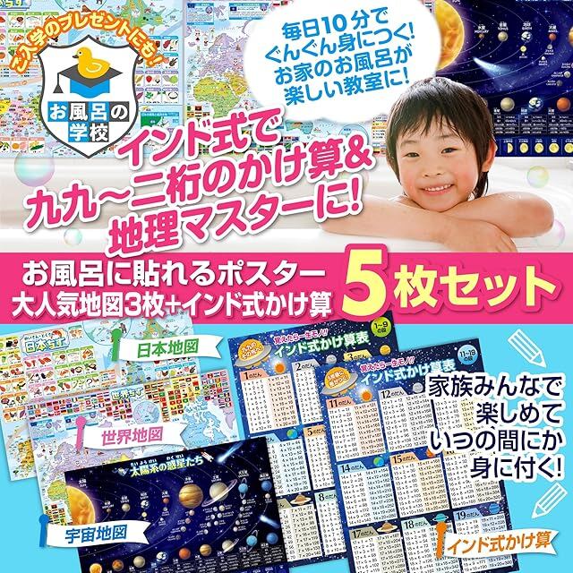 お風呂の学校 セット価格 地図/インド式かけ算(1-9の段&11-19の段)宇宙 お風呂ポスター2種類セット 日本製 地理 学習 知育 社会 算数 九九 B3サイズ 防水
