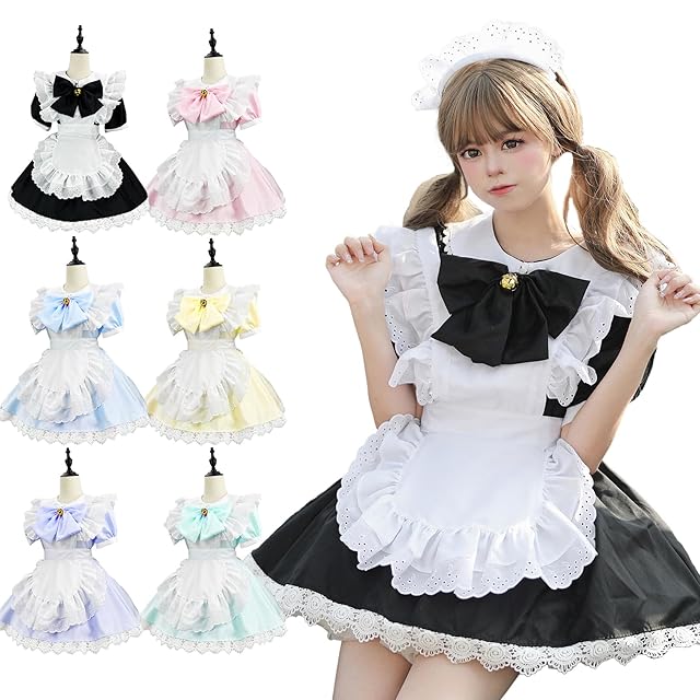 [MEYOIJK] メイド服 コスプレ 萌え コンカフェ メイド 定番 ショート丈 可愛い レース メイドコスチューム 5点セット ロリータ ワンピース レディース メンズ 大きいサイズ 仮装 ハロウィン 女装 人気 学園祭 撮影 (ブラック, XL)