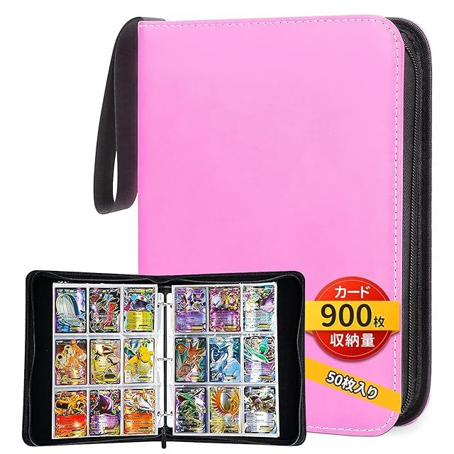 カードファイル トレカファイル 9ポケット 900枚収納 50枚入り 表紙はPVC素材の防水性と耐摩耗性のカードバインダー ポータブルファスナー カードシート他のゲームカード収納用 (9ポケット, ピンク)