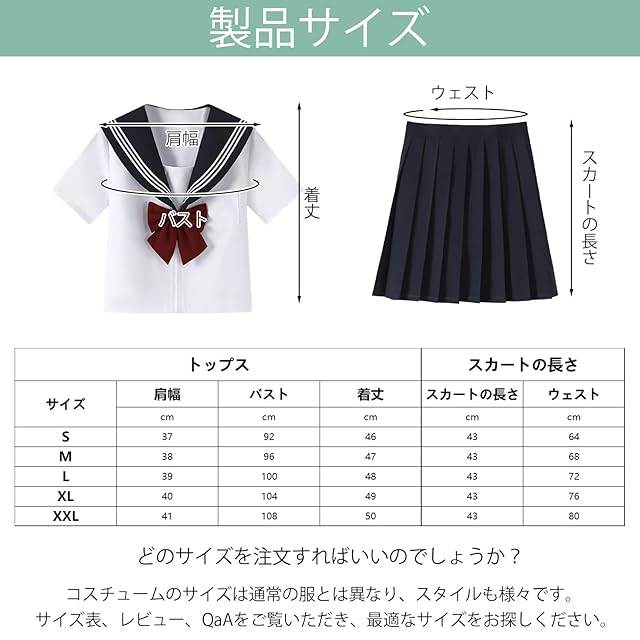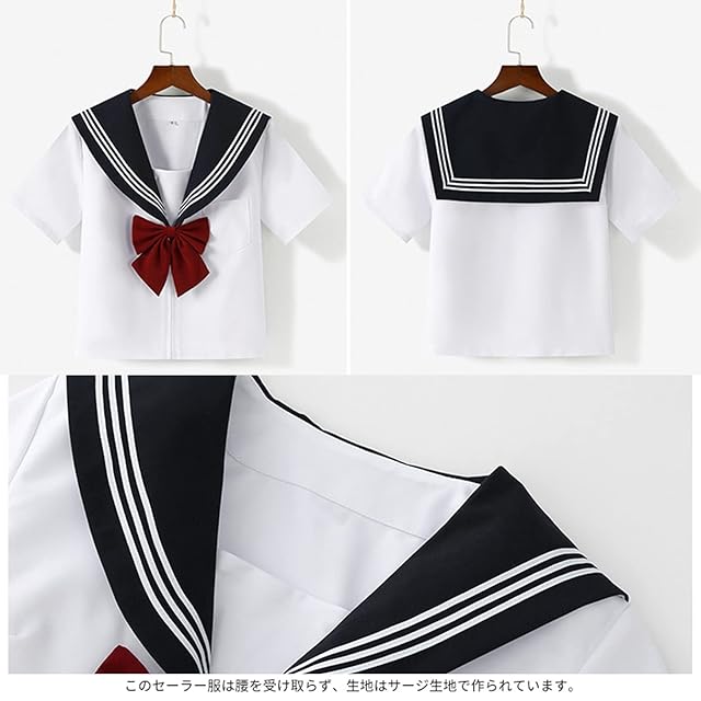 【デザイン】白シャツはゆったりとした短めの丈、プリーツスカートは体型の黄金比を強調するようにデザインされたちょうど良い丈です。セーラー服は白シャツが単調になりすぎないように関西襟と小さなポケットをつけ、プリーツスカートは変形しにくいように高温でアイロンをかけています。 赤いリボンは、ガーリーな雰囲気で可愛らしい視覚効果をプラスしています。 シャツのステッチもきちんと繊細で、色あせしにくいです。