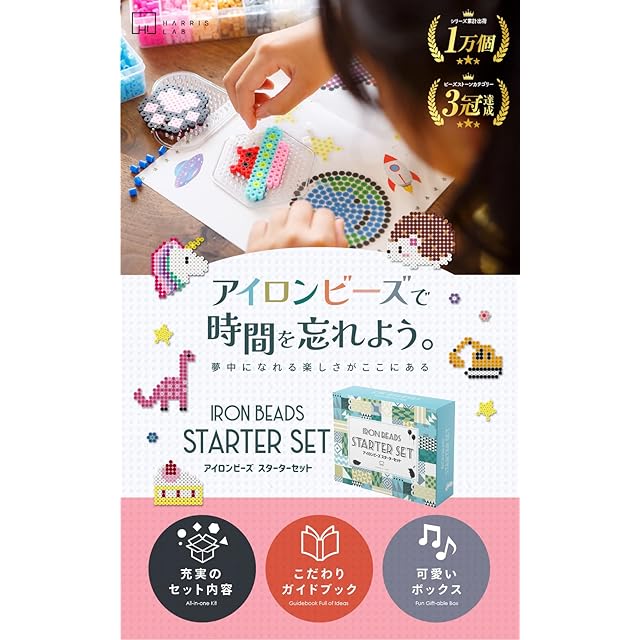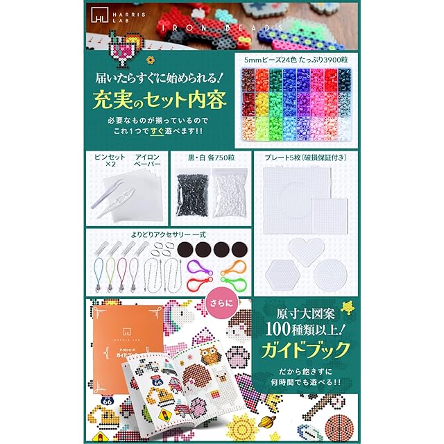 商品名:[ハリスラボ] アイロンビーズ セット 5mm 『スターターセット』 24色 図案100種類 約5400粒 白 黒 補充付き ビーズアイロン シート プレート ピンセット