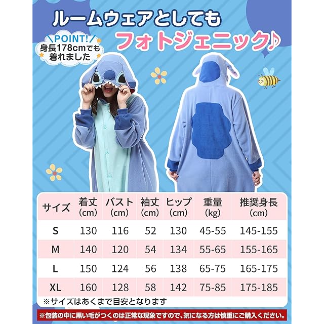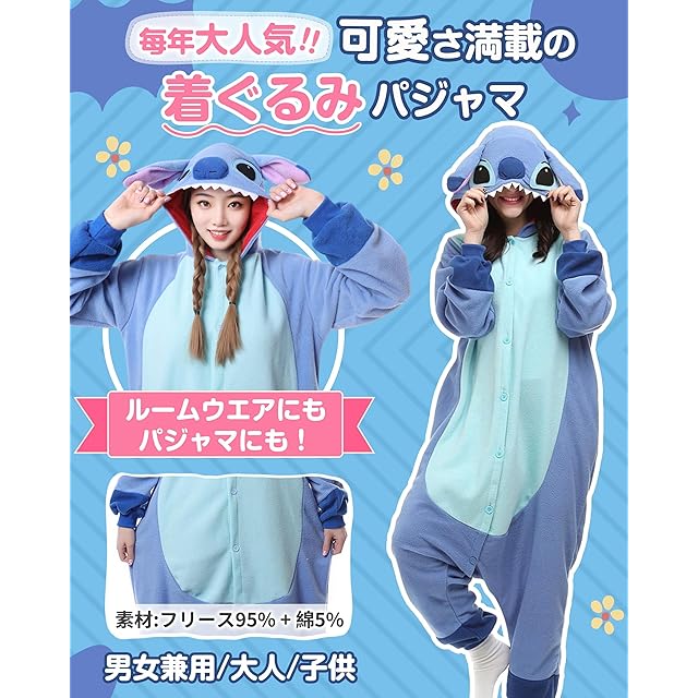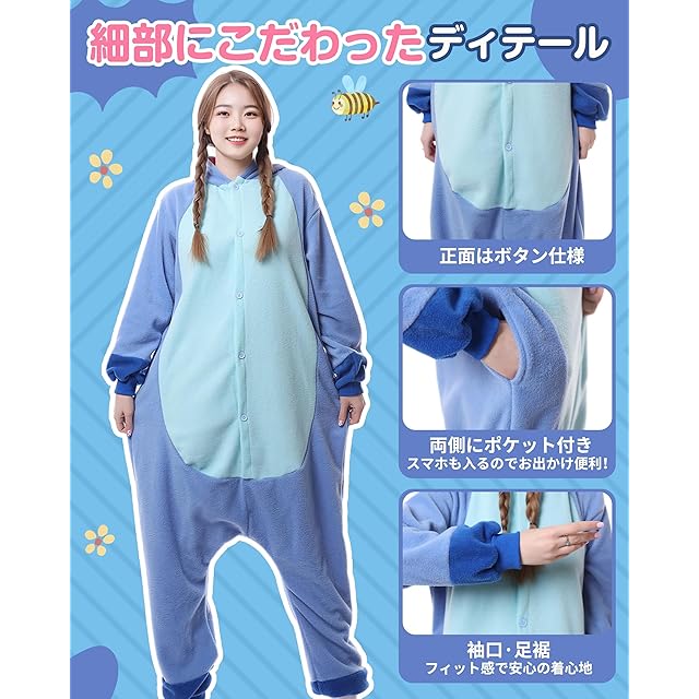 ✅【ルームウエアにも!パジャマにも!】人気キャラクターのかわいい着ぐるみで、ゆったりサイズで、ルームウェアやパジャマ、ハロウィンの仮装にも、秋冬にぴったり。対象:男女兼用、大人、子供<br/>✅【細部にこだわったディテール】❶両サイドにスマホが入るポケット付きで、お出かけにも便利! ❷股下は途中までつながっており、ゆったりとしたシルエットです。 ❸バストとウエストはかなりゆったりしています。 ❹袖口と足裾はフィット感があります。 ❺(ピンク)前開きジッパーで着替えは楽々。(ブルー)正面はボタン仕様。好みに合わせて選べる!!<br/>✅【フリース素材で快適】フリース生地(フリース95%+綿5%)を使用し、柔らかく心地よい肌触りで暖かさを保ちます。かわいさ満載の着ぐるみパジャマです。<br/>✅【ルームウェアとしてもフォトジェニック】おしゃれで暖かいデザインは、お部屋でのリラックスウェアとしてはもちろんのこと、フォトジェニックなアイテムとしても使えます。お洒落で暖かい秋冬向けのパジャマ、家族や友達とお揃いもおすすめです。お誕生日祝い等のプレゼントにも!<br/>✅【適用場合・お手入れの注意事項】コスプレ衣装、イベント行事、お誕生会、ハロウィン、撮影用、クリスマス、カーニバル、イースター、パーティ、化粧舞踏会、演出、誕生日プレゼント、学園祭、お祭り、文化祭、贈り物など!30度以下の温水で弱めでの洗濯・もしくは手洗いをお勧めします。また、縫製品特有のほつれや汚れは洗濯で取り除けます。摩擦による色移りにご注意ください。