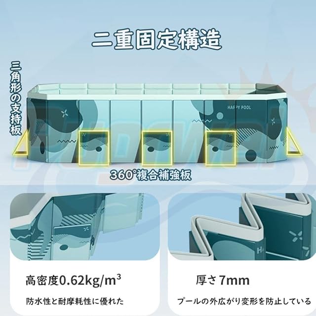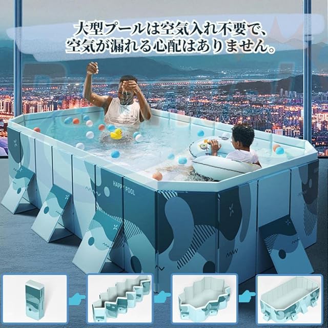 【高品質耐久性プール大型】この折りたたみプールは、複合補強板とPVCで構成されている。PVC複合補強板の生地は最先端の技術で耐摩耗性と防水性が高いため、周囲には複数の三角形の支持板が分布しており、プールの外広がり変形を防止している。<br><br> 【空気入れ不要プール】大型プールは空気入れ不要で、空気が漏れる心配はありません。組み立て不要、取り出して広げるだけで、水を入れるだけですぐに使えます。一人だけでも広げることができます。<br><br> 【二重排水口設計】子供用プールの底と側面に排水口がある、蓋を開けてすぐ排水できます。排水栓が二重構造により、プール遊びの時に水漏れの心配はありません。水遊び後の片付けも簡単になります。ご注意:安全のため、水量は最大容量の80%を超えないように注意してください。<br><br> 【折りたたみプール持ち運び便利】折りたたみ式で面倒な空気入れが不要です。使う時はサッと取り出して広げ、使わないとき、場所を取らないコンパクトに収納し、便利で持ち運びやすく、アウトドアや旅行の際に便利です。家族みんなは猛暑の夏にクールを感じられます。<br><br> 【暑い季節に大活躍プール 】家でも楽しく遊びを!夏の暑い時期に家でも楽しく遊べる大型ハッピープールを開発しました。ご自宅や公園などでファミリープールを使って楽しく遊んでください。 ボールプール、子供用 プール、ペットプール、家庭用 プール、子供のおもちゃ箱として大活躍します。屋内プール、お庭、ビーチ、屋外などいつでもどこでも簡単に使える。<br><br>