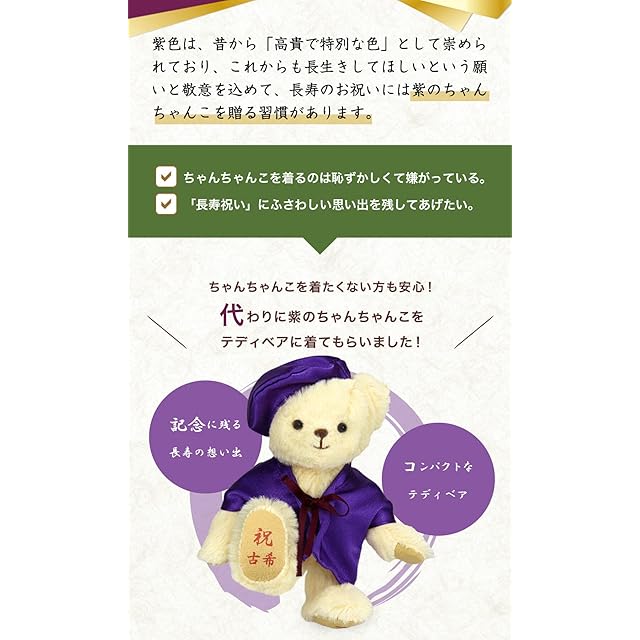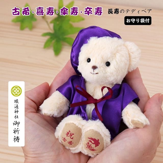 ちゃんちゃんこを着るのは恥ずかしい方もこれで安心! 「代わりにちゃんちゃんこをテディべアに着てもらったよ!」 かわいい表情のテディベア。 紫ちゃんちゃんこを着てちょこんとお座り! 玄関などに気兼ねなく飾れるちょうどいいコンパクトサイズなのも魅力のひとつ。このテディベアは心願成就をご祈祷頂いた縁起物。 持ち運びに便利な専用小袋に入れると、御守としていつでも傍で健康と安全を見守ることが出来ます。